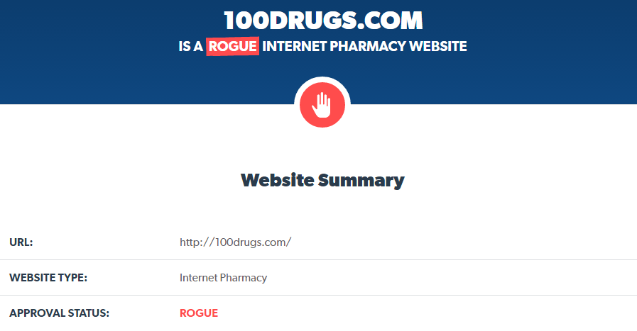 100drugs has been classified as a Rogue Pharmacy by LegitScript. It means that they did not meet any criteria set up to be considered as a safe internet pharmacy. Some rules and regulations may have been violated which contributed to the safety and trust issues of the website.